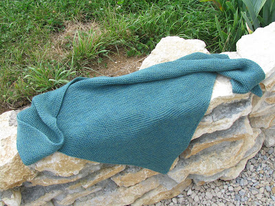 4) Au dernier point, preuve irréfutable de mon courage à toute épreuve. J'ai tricoté ce trendy par 35°, la laine posant négligemment (300 grammes de pure laine, quand même) sur les genoux. Et j'ai a-do-ré ! J'ai même poussé le vice jusqu'à me faire prendre en photo en petite robe d'été, le châle autour du cou (merci au photographe qui a su garder son sérieux).